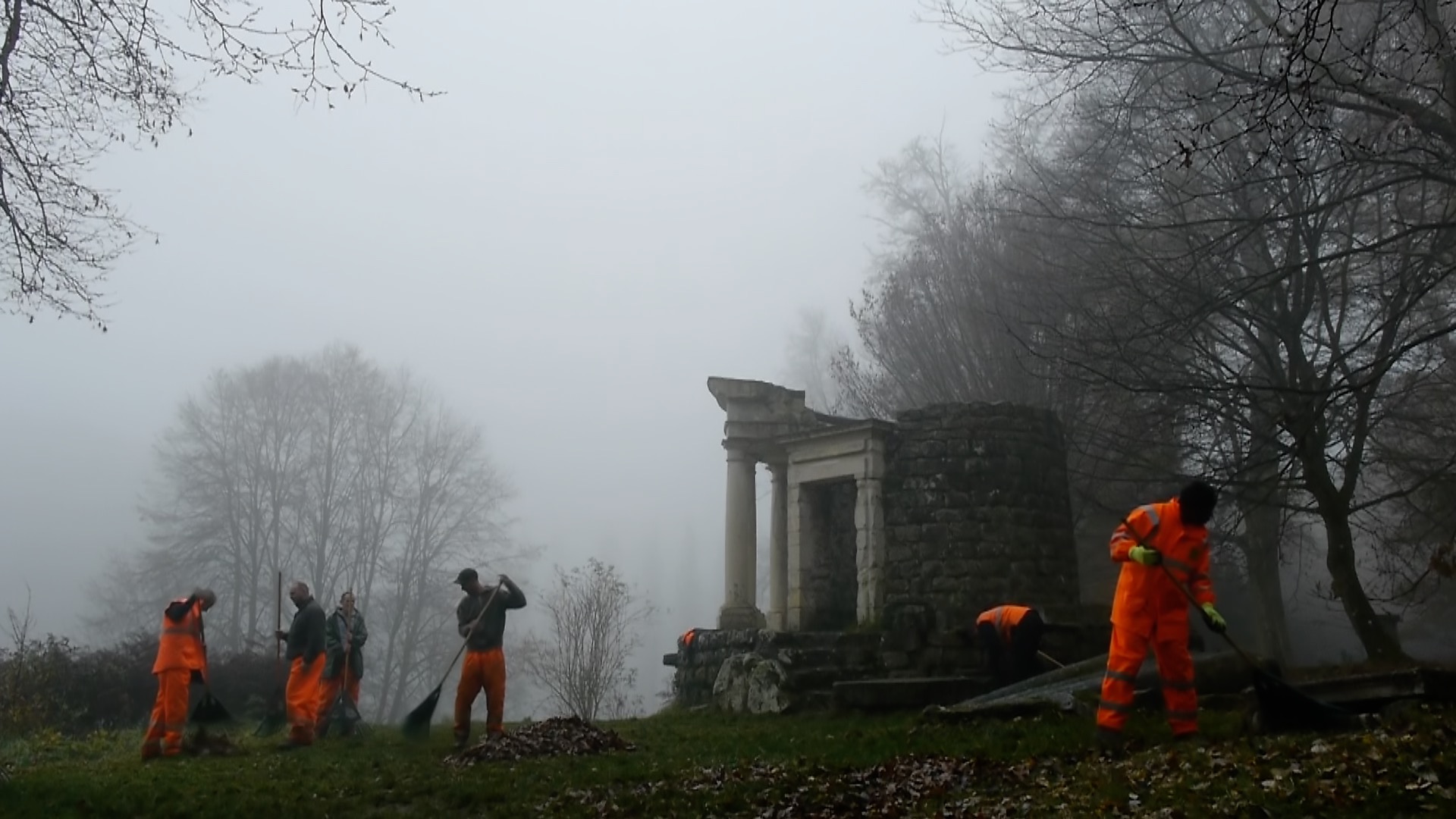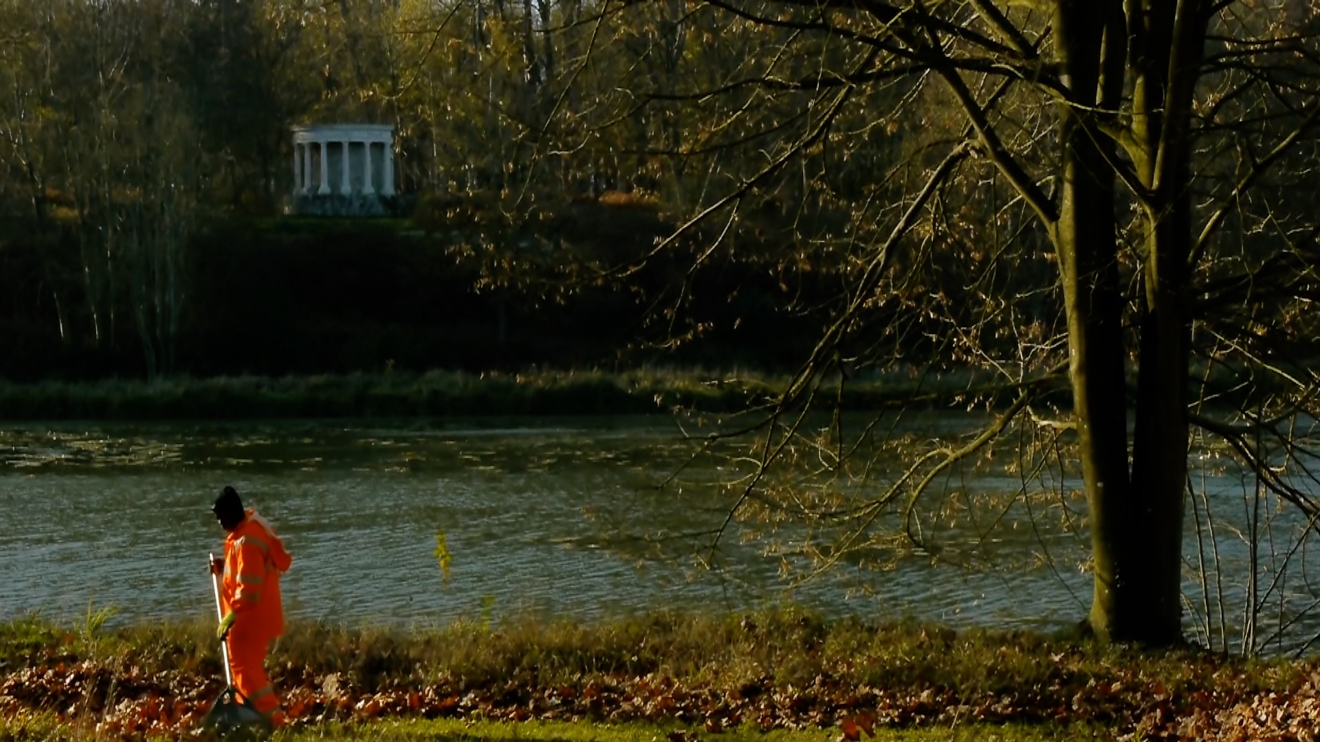 L’hiver succède à l’été dans le jardin désert d’Ermenonville, incarnation paysagère de la pensée de Rousseau créée au XVIIIème siècle. Puis des jardiniers habillés en orange comme des ouvriers de voirie surgissent dans les tableaux bucoliques très composés. Exécutant des tâches absurdes, ces travailleurs en insertion se sentent abandonnés par la société et entrent en résistance passive dans un décor où apparaissent de plus en plus les signes de la modernité.
